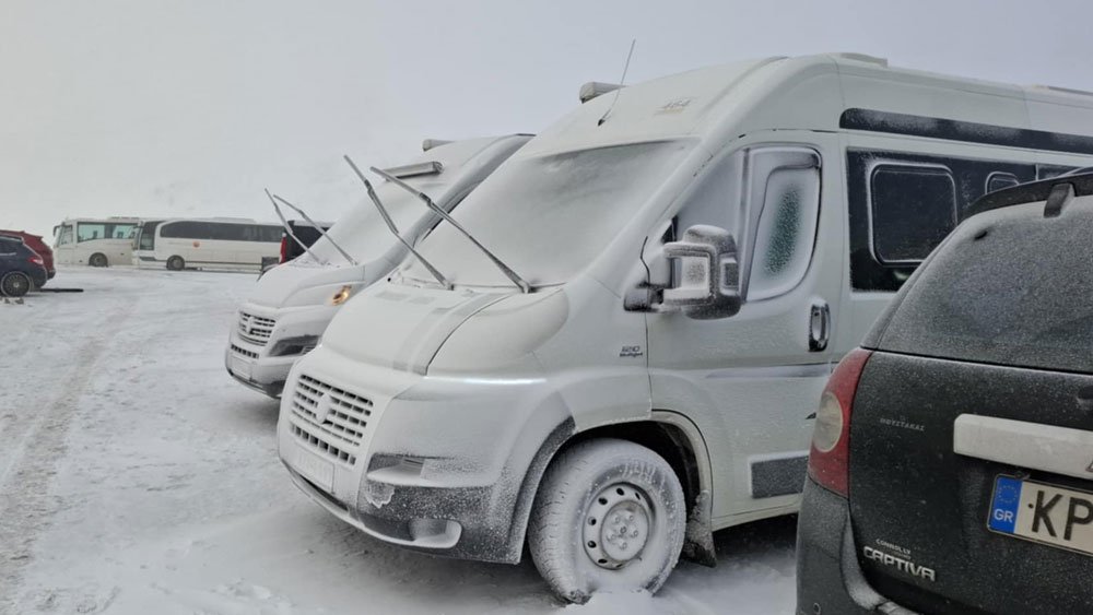Με έναν δαιμονισμένο αέρα να μας χτυπά αλύπητα με πολύ ψιλό και σχετικά σκληρό χιόνι, το να βγεις έξω για μερικά λεπτά ήταν από μόνος του ένας μικρός άθλος. Τα campers κουνιόνται λες και είναι βαρκούλες σε φουρτούνα, ενώ εμείς για την ώρα ακόμη το διασκεδάζουμε και όλοι μαζί πλέον στο camper του Γιάννη και της Αθηνάς, πίνουμε τα ποτάκια μας μαζί με φρούτα και χαλβά Φαρσάλων.